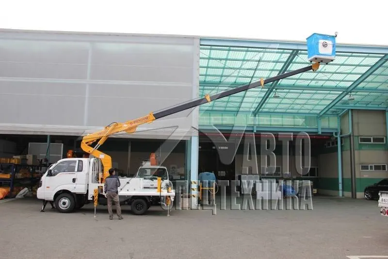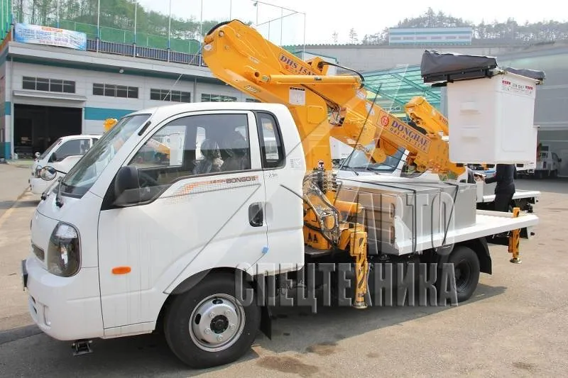 Автовышка Donghae DHS15AP корейского производителя Donghae Machinery подходит для работ в сферах городского и коммунального хозяйства в Сочи: выполнение электромонтажных работ, монтаж рекламных щитов и конструкций, ремонт кабельных линий. Также может использоваться в строительных работах. Она состоит из бортовой платформы и крановой установки с рабочей высотой стрелы 14,5 м.